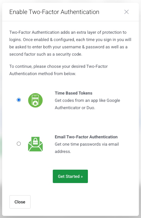 2. May choose your desired Two-Factor Authentication method and click "Get Started" to proceed.