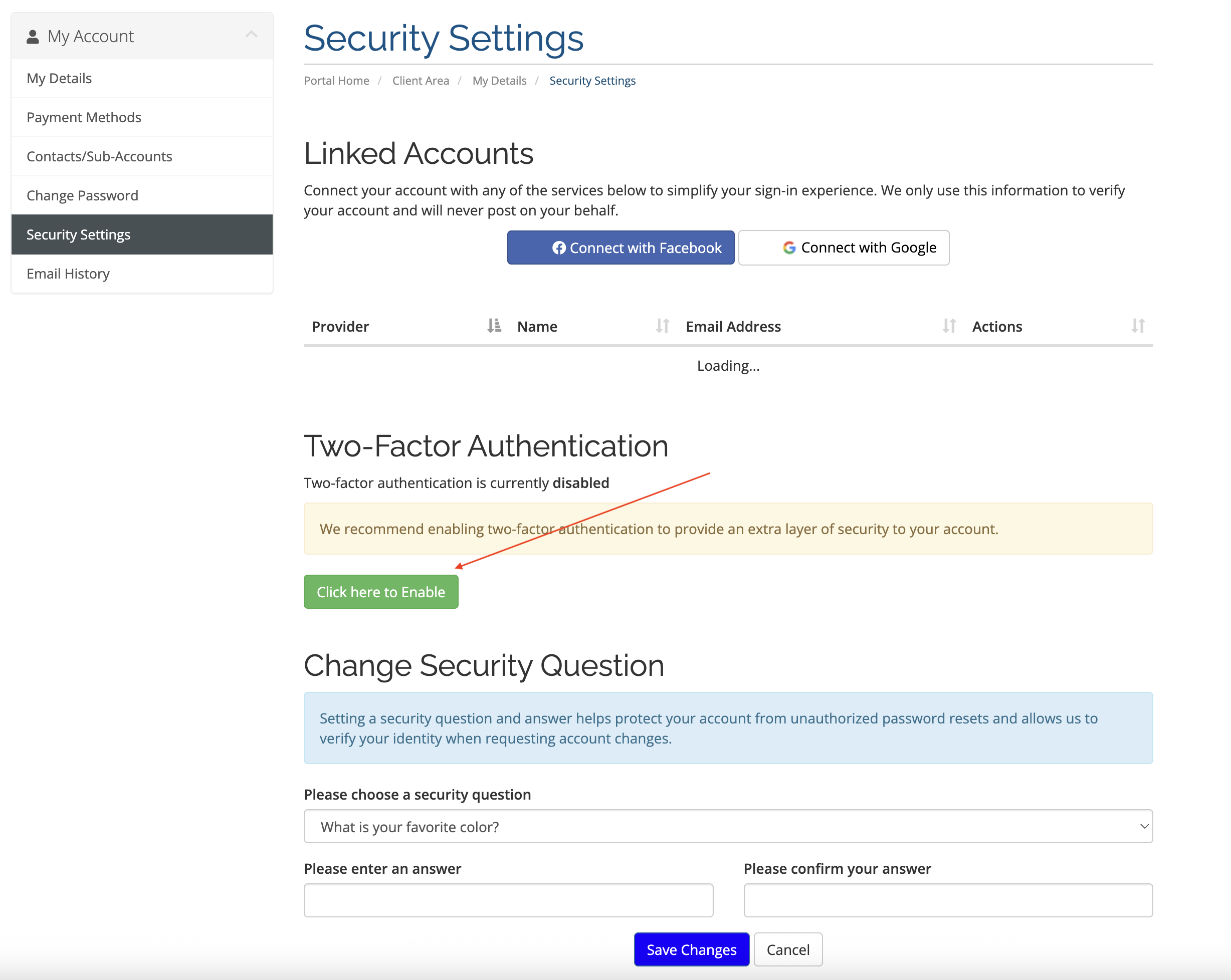 1. Log into your Emerge billing account, you will see the Two-Factor Authentication setup page. Click "Click here to Enable" to proceed.